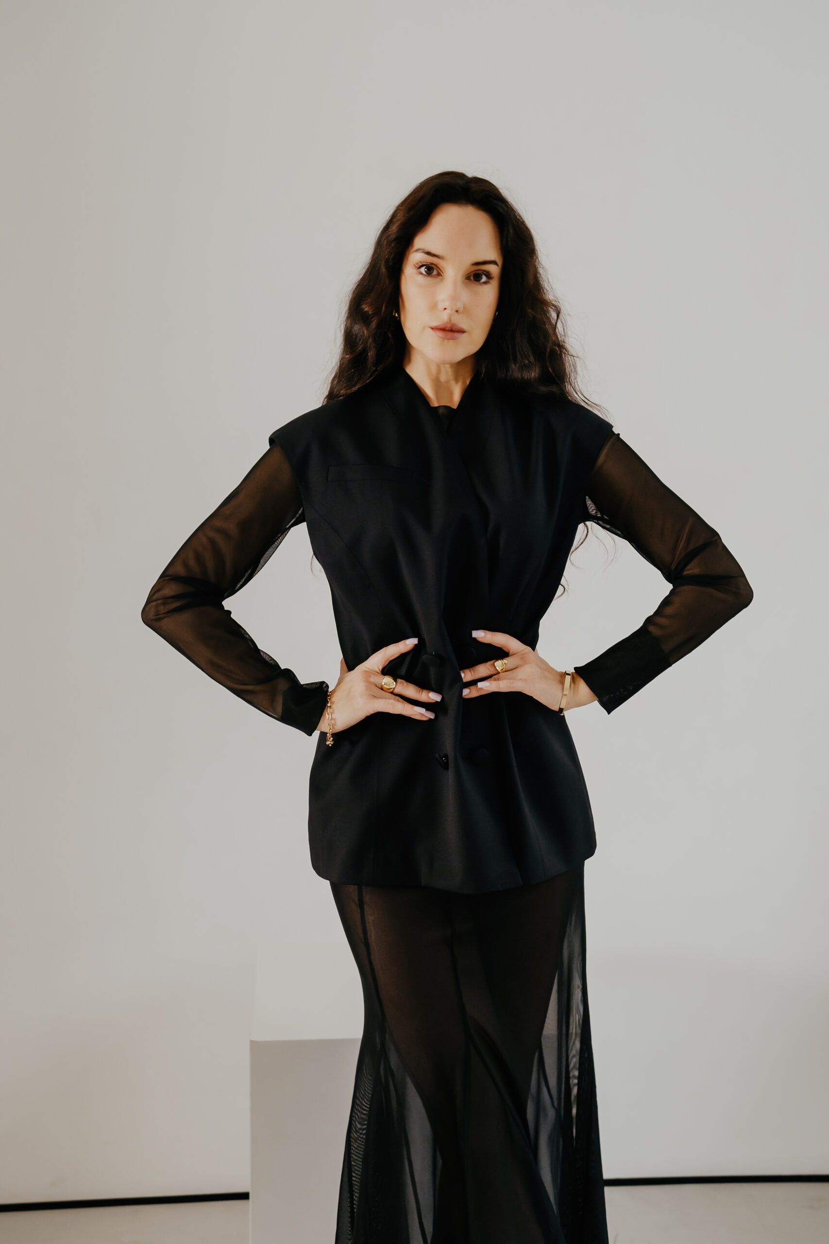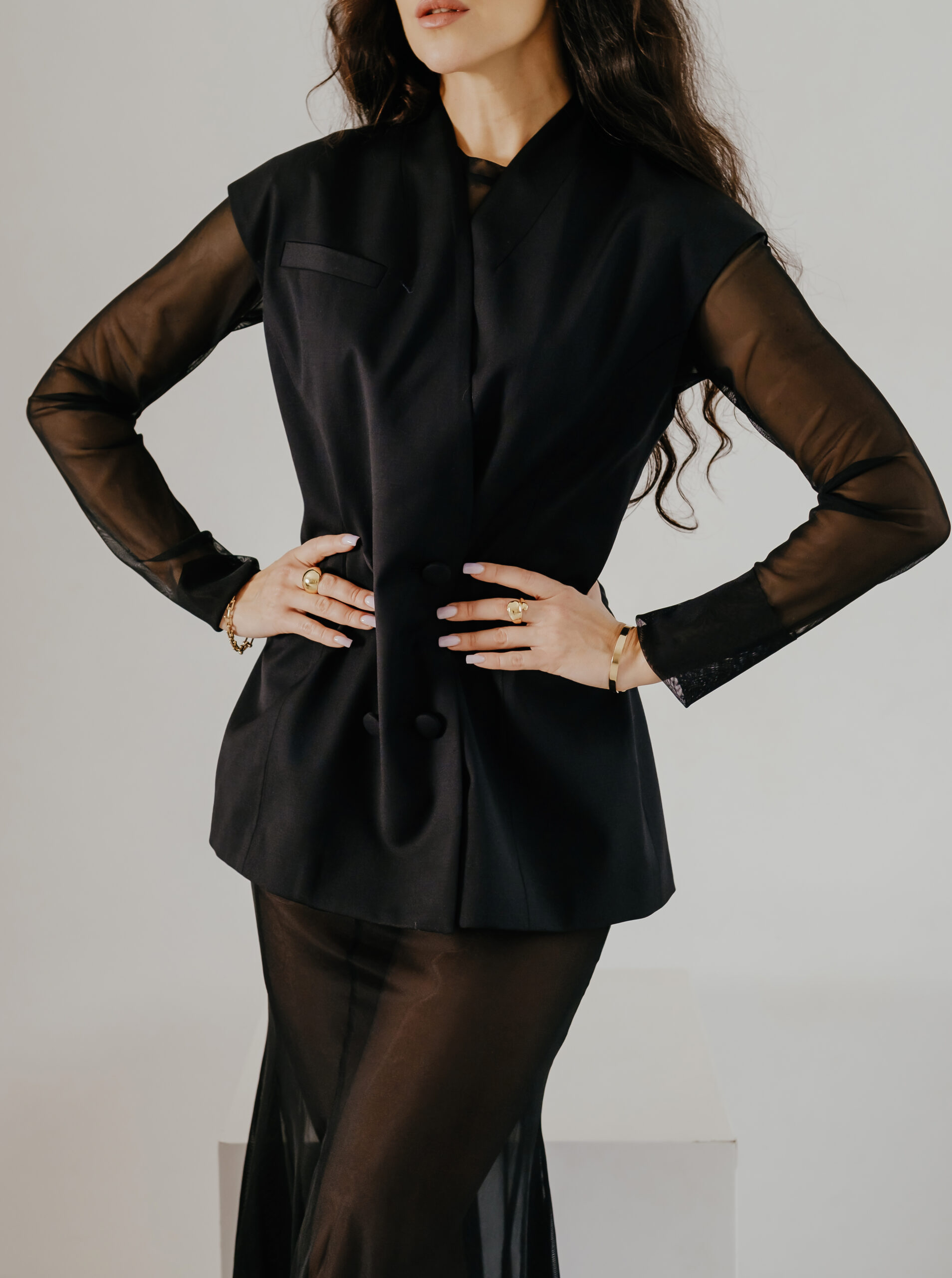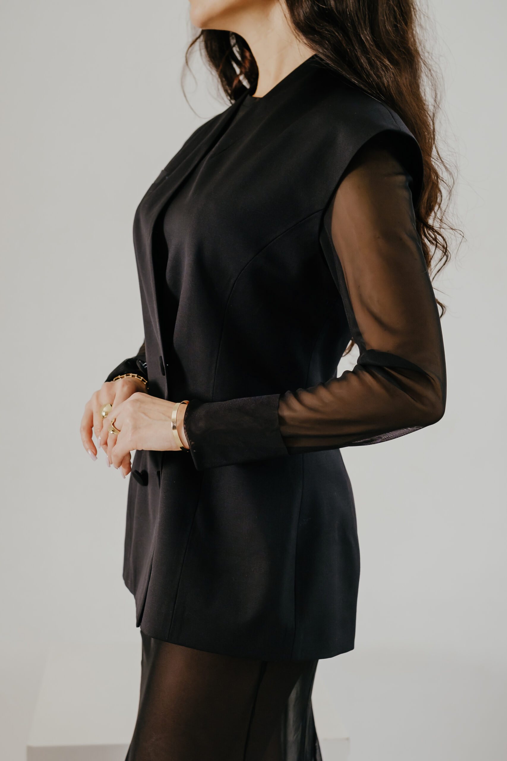 Жилетку легко стилізувати: носіть її на голе тіло для сміливого вечірнього настрою, поєднуйте з прозорими топами для сучасного ефекту або додавайте до класичних сорочок, коли потрібна елегантна, інтелігентна комплементарність. Вона однаково гармонійно працює як у total black, так і з контрастними відтінками, створюючи акцент на формі й лініях.